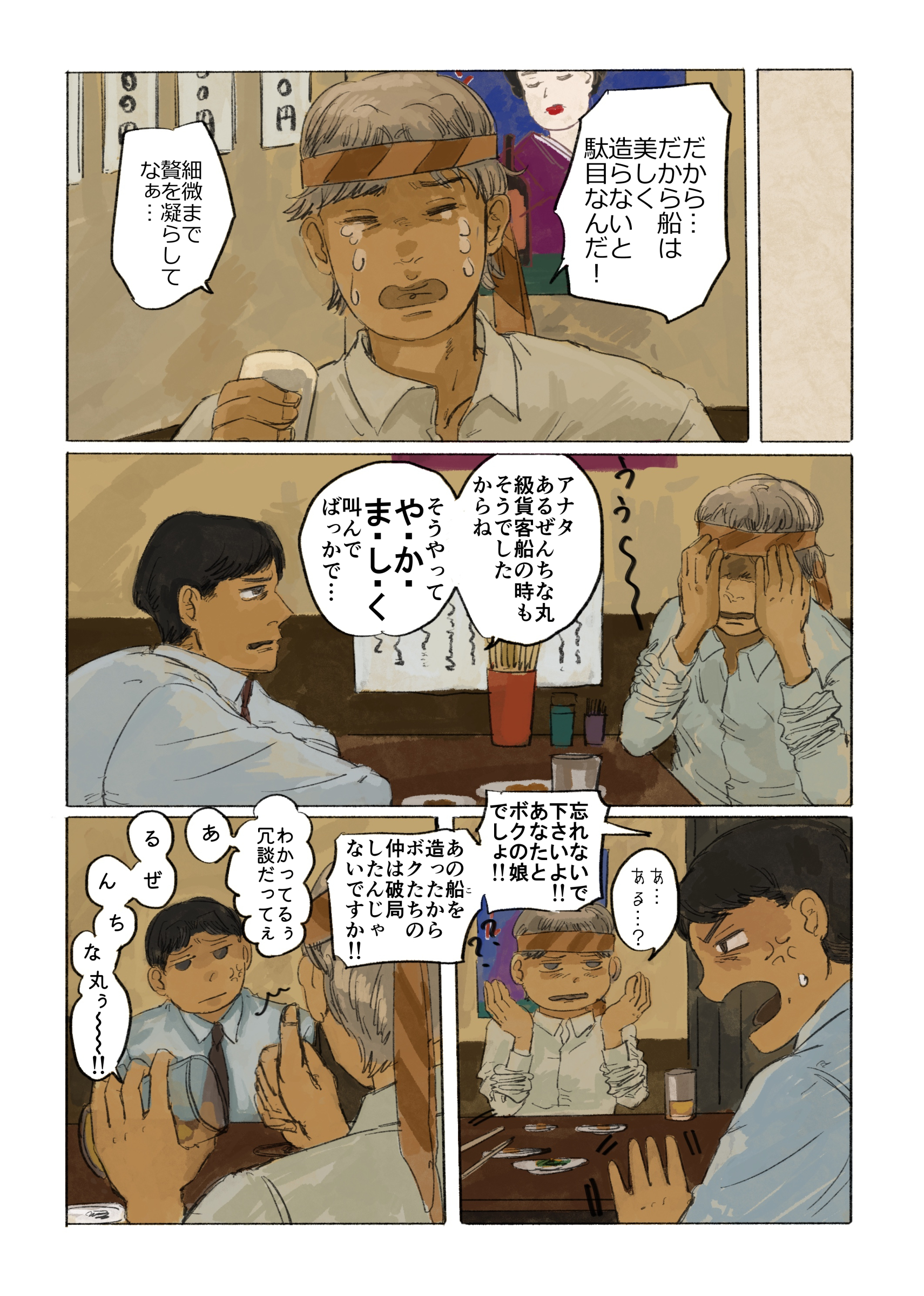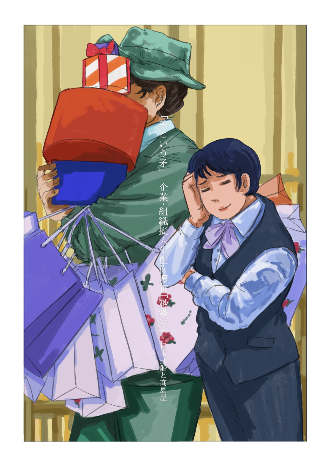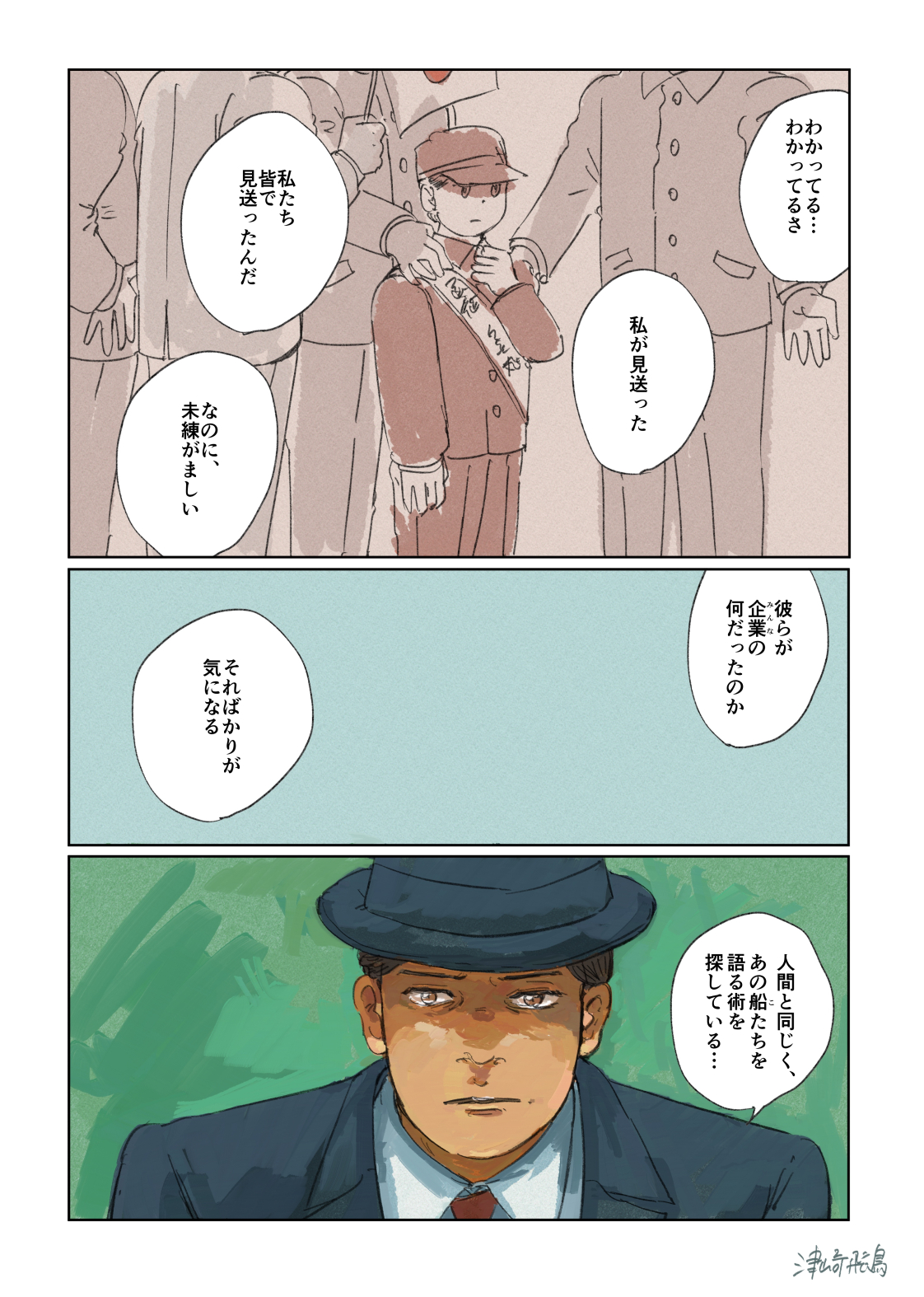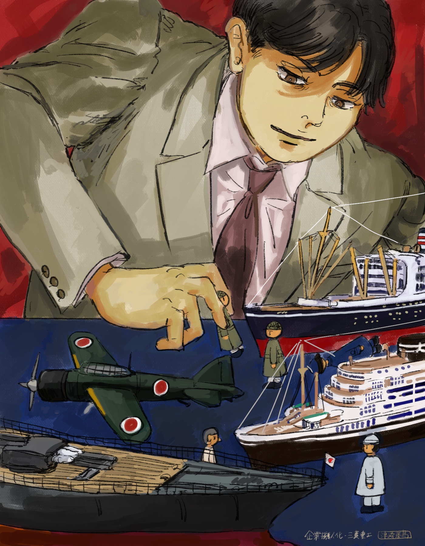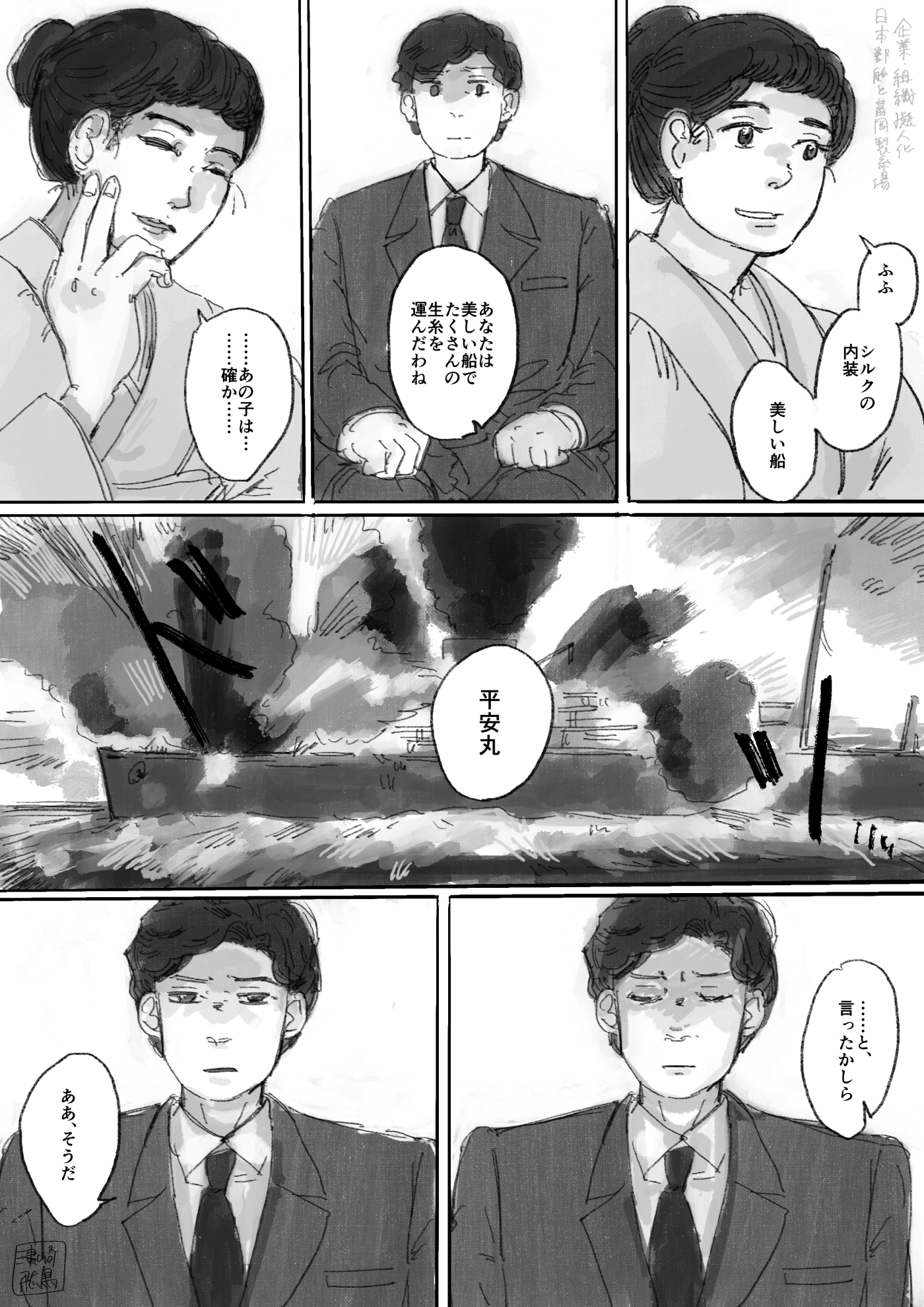 作品 2026/01/17 Sat 企業・組織擬人化創作「渺渺録」 (短編連作集。未完) 日本郵船が『日本郵船戦時船史』を編纂する1971年の逡巡と追想と、そこから広がる企業みんなの昔話。 Company & Organization Gijinka Count of Life“Remembrance and Separation”So Far from the Sea 「作品ログ」タグ:渺渺録 #「渺渺録」(企業・組織擬人化) #日本郵船 以下、すでに描いたものを時系列順に並べたもの(本編を仮組したもの)です。 ※とても長いので注意 本編の仮組 畳む
