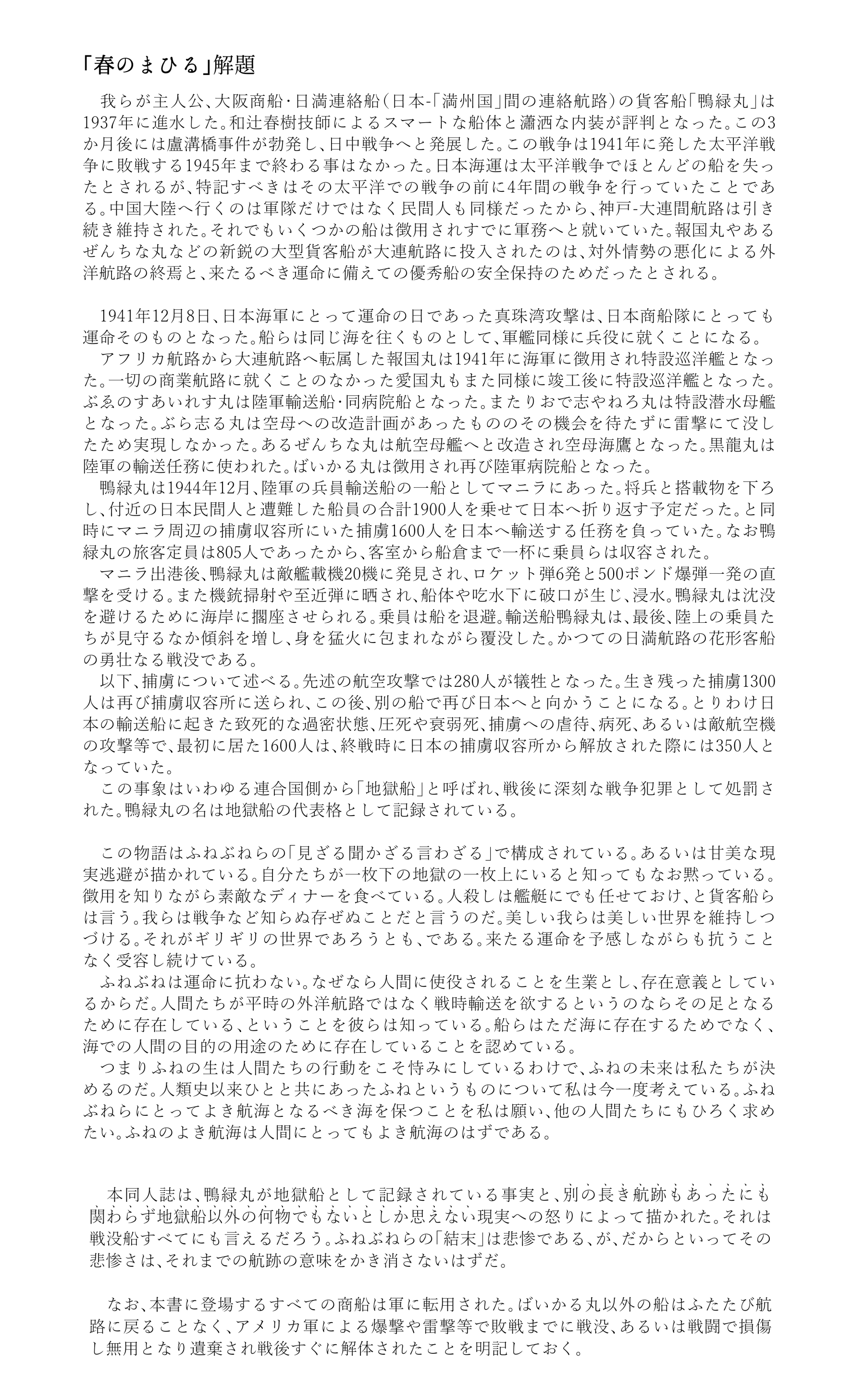 船に感情というものがあったとしたらという観点に立って特設艦船の心情や悲喜を探ってみたいと思う時がある。特設艦船とは軍隊により接収され改造・改装された船のことで、貨客船・貨物船から小型漁船まで多くの船を網羅する。それら船の共通点は戦わないこと、戦うための船ではないことであり、軍の徴用や買収は戦争への参加を押しつけられた切符であった。多くの船にとっては片道切符となった。早々に戦没する宿命だったからである。
