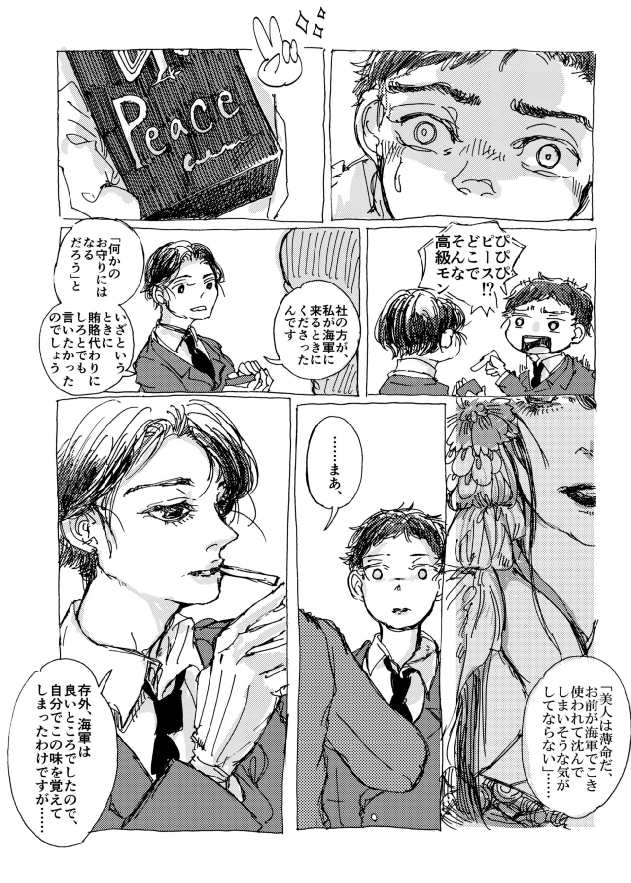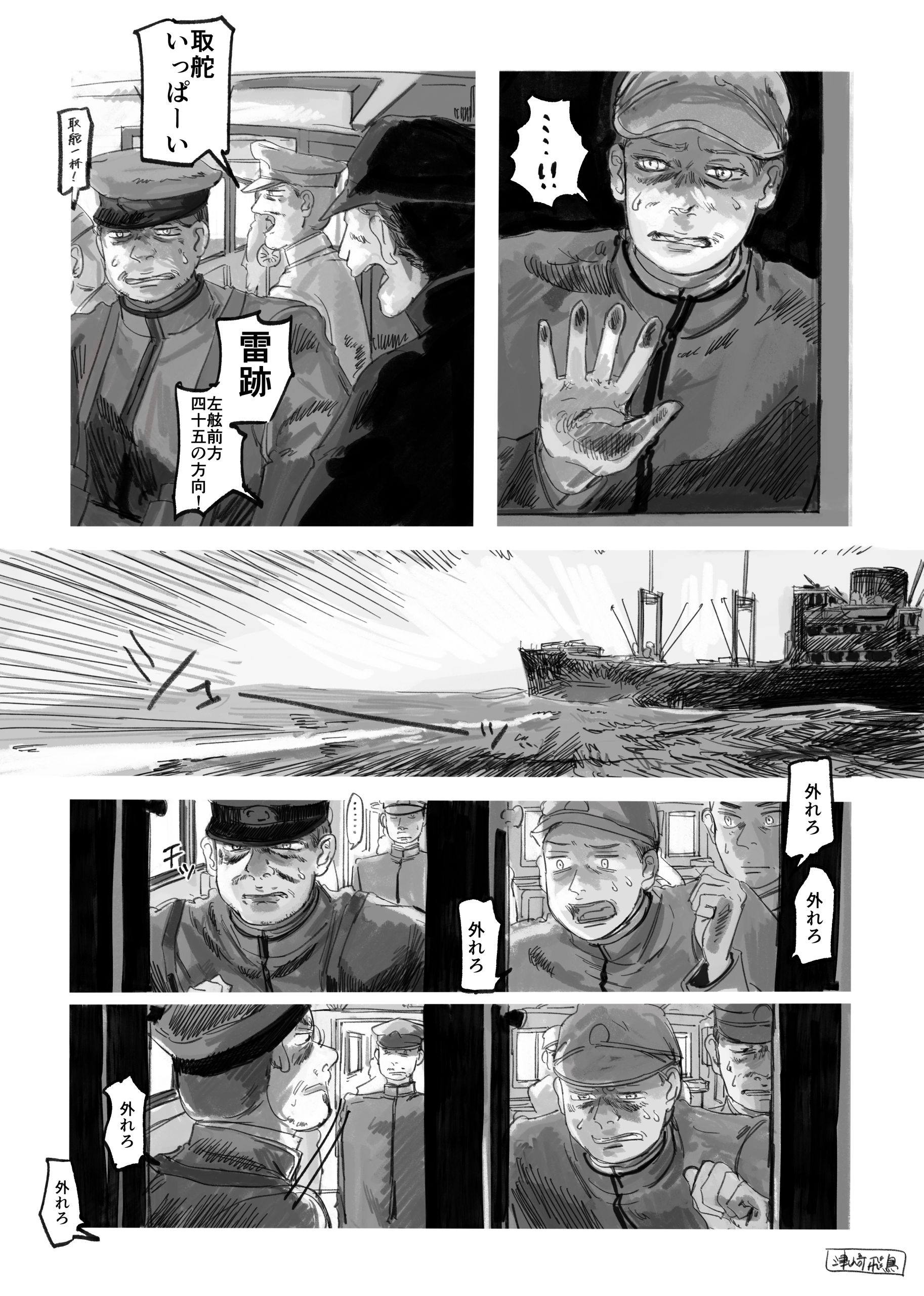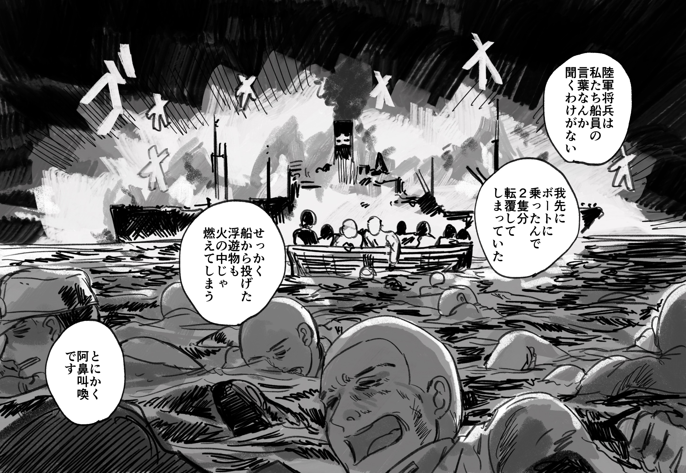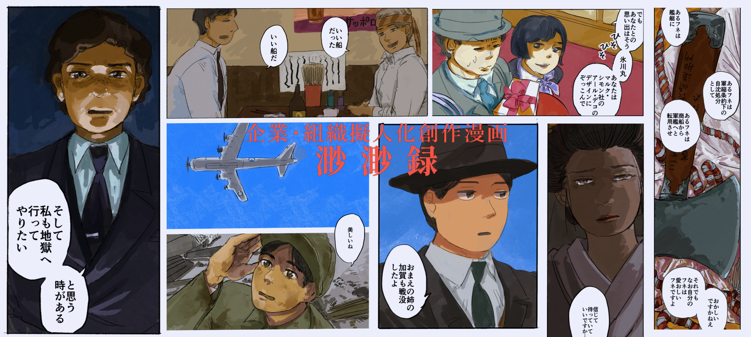 最近、戦争で船が撃沈されている漫画を描いていますが、こうやって「自分の船が軍や政府に持っていかれて沈んでしまった企業の戦後の話」を擬人化で描いたものが『大脱走』となります